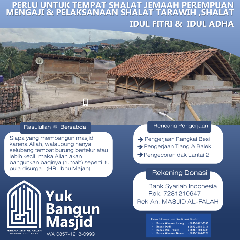 Kami Sangat Berharap Lantai Dua Masjid Al -Falah Segera dibangun karena dikampung kami belum ada lapangan untuk shalat idul fitri atau idul adha jadi pelaksanaan masih masih dimasjid jami Al-falah, sedangkan kuota jamaah lantai satu yang baru dibangun hanya sekitar 114 jamaah itupun belum muat untuk jemaah laki-laki,karena mesjid jami Alfalah digunakan shalat berjamaah dua wilayah RT yang jumlah KK nya pun sekitar 100 kk lebih dari 1 KK 3 orang saja yang ikut melaksanakan shalat idul fitri tentu masjid belum bisa memadai, untuk perempuan kami berharap bisa dilantai dua , semoga saja ada muwakif agnia yang Alloh gerakan untuk mendukung pembangunan masjid Alfalah Gandol Cicadas ini, Aamiin bisa menghubungi admin di wa 085712180999