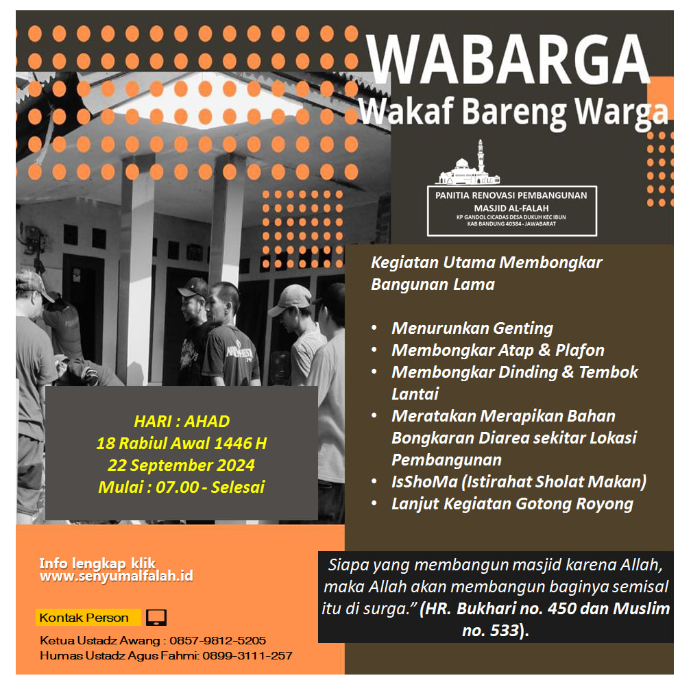 Navigasi pos Serah Terima Hasil Jemput Wakaf Mingguan Petunjuk Arah Kesekretariat Senyum Al falah Tempat Shalat Berjamaah Sementara Selama Masjid Al Falah Belum Bisa Digunakan Kembali